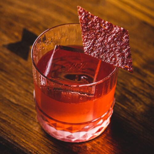 Tanqueray Gin, Carpano Antica, Strawberry Campari, Strawberry Syrup, Kō Hana Kokoleka, Strawberry Campari Fruit Leather.
