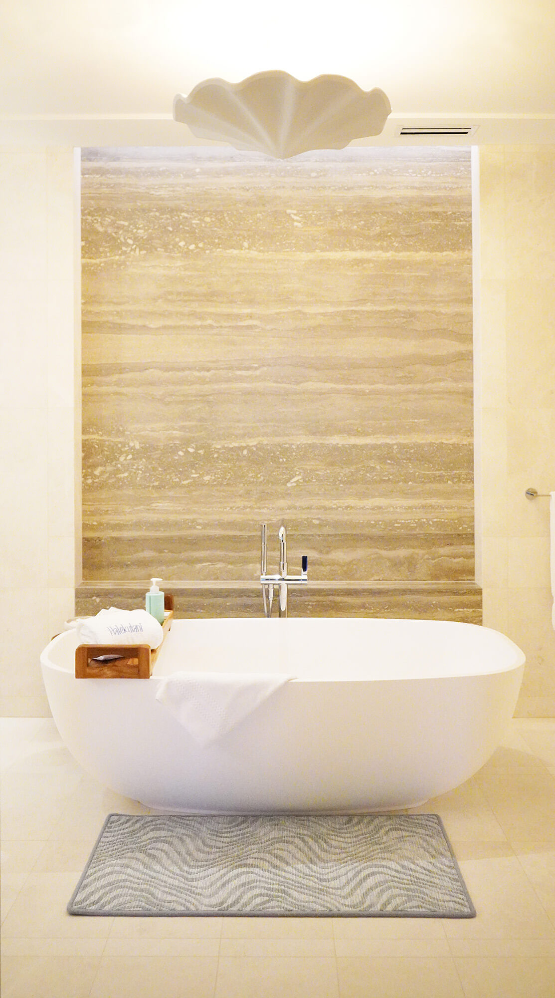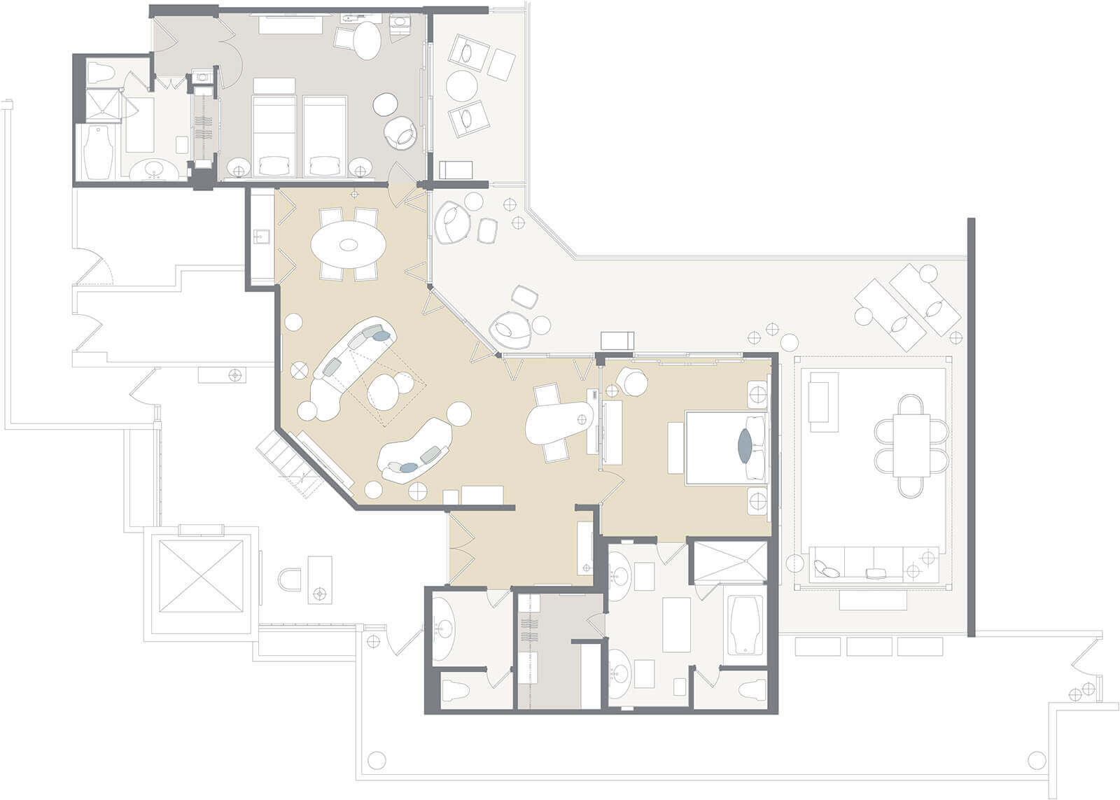 Renowned New York design firm Champalimaud spared no detail in the creation of this suite. From the soaring high ceilings and meticulously crafted finishes to the indulgent modern soaking tub, every element has been thoughtfully designed to offer an unparalleled level of luxury.