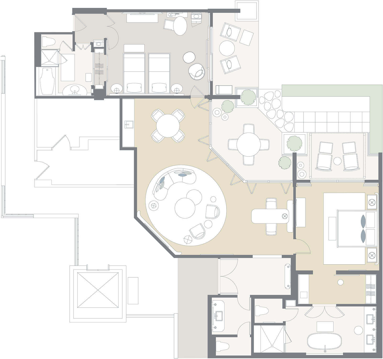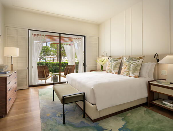 Located on the ground floor and facing the pool area, this suite is the only one offering dual entrances: one from the guestroom hallway and another from a private poolside entrance. This provides seamless access to the lush courtyard and the signature Orchid Pool, combining privacy with convenience.