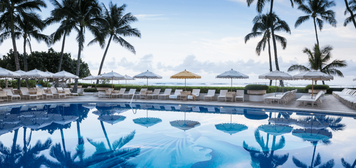 Direct views of the Halekulani’s signature Orchid pool with the Pacific Ocean as its backdrop